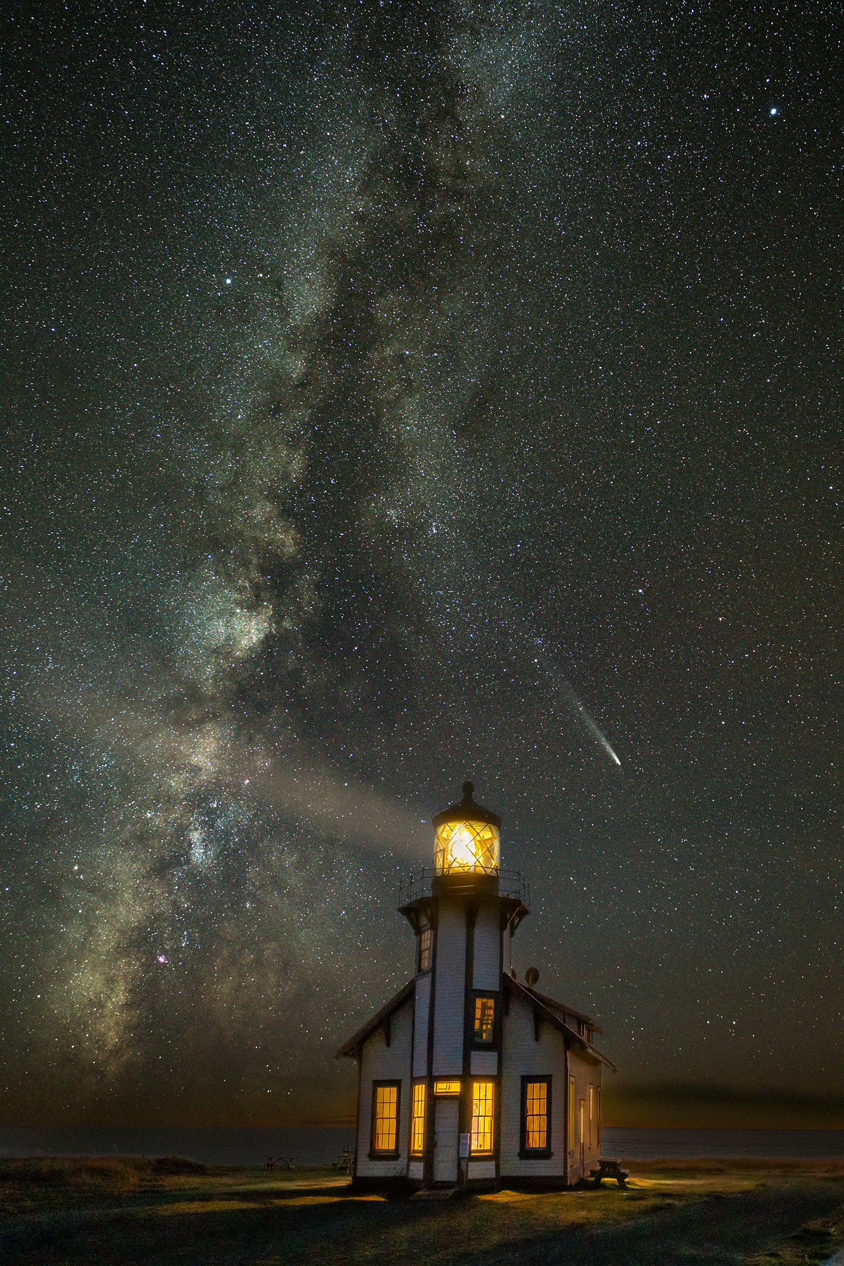 Comet Tsuchinshan ATLAS paid a once every 88,000 years visit to the inner solar system in October of 2024. When it was at its closest to earth, it was easily visible to the naked eye. This photo was taken about 10 days later when the moon was not yet up in the sky, and it was dark enough to also capture the milky way. Point Cabrillo Light on the Mendocino Coast stands in the foreground.