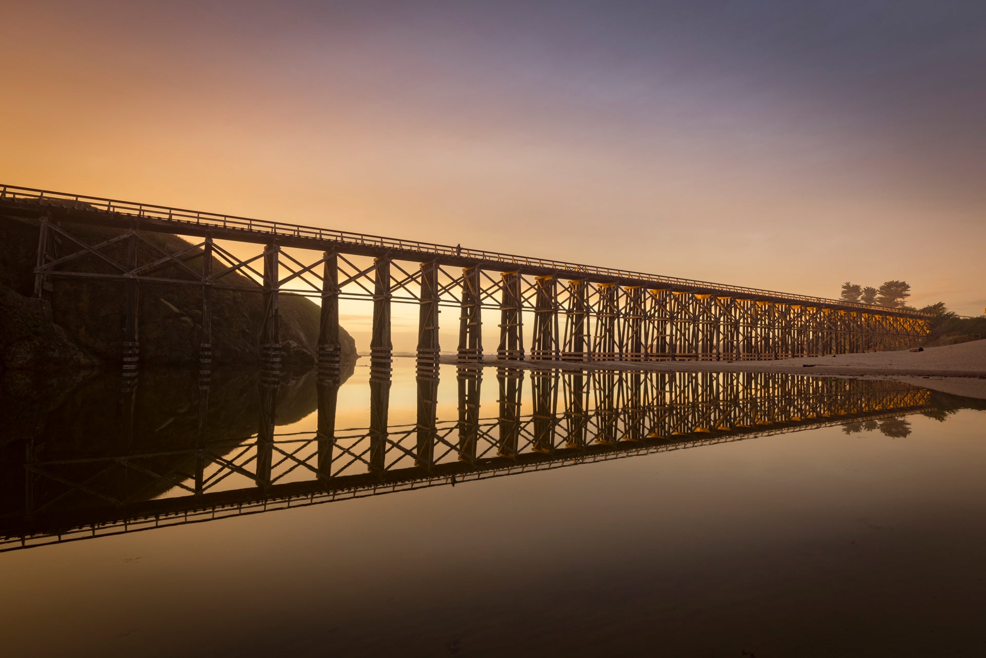 Pudding Creek trestel bridge reflected in perfect stillness as setting sun lights the sky.