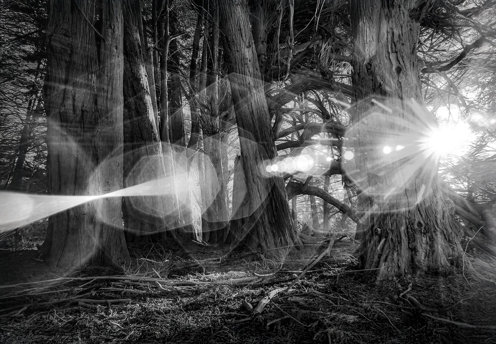 Infrared images almost always provide a unique view of things. The intense sidelight here created the amazing array of reflections that clash across the trees and create the dramatically highlighted circular opening that reveals the distant branches.