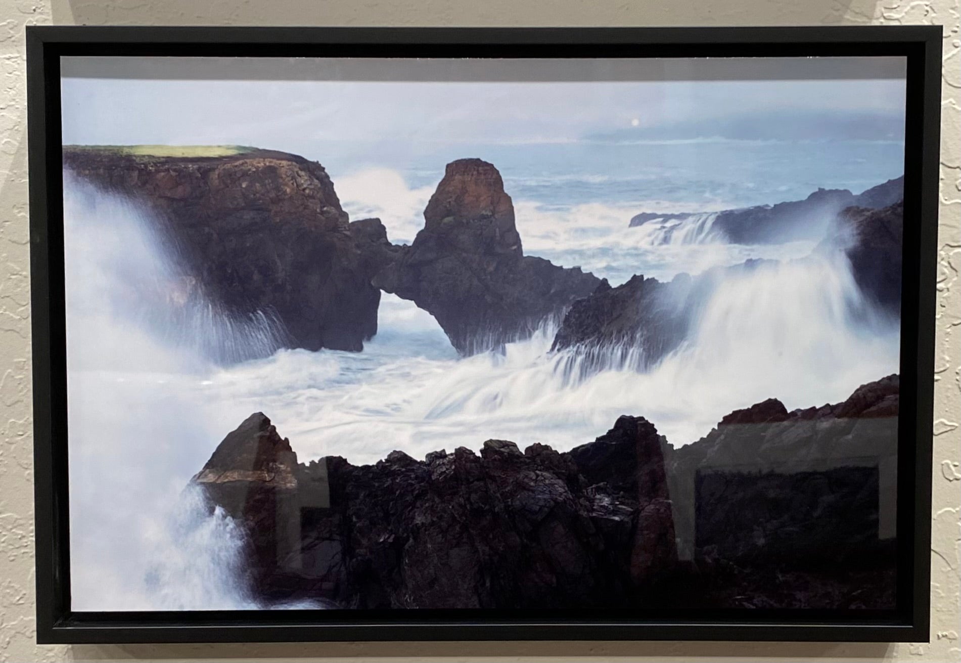 Wild waves at Washing Machine Arch (our name for this spot that hosts such a dynamic spectacale when conditions are right), at Mendocino Headlands State Park, complete with a fog shrouded view north towards the Point Cabrillo headlands in the distance. This was a thrilling ride as I waited for the perfect combination of waves to all happen a the same time. I was eventually driven off the headlands by the horizontal wind, rain and hail that made me flee to the car at a dead run because of the suddenly unbearable cold and wet conditions on what had only an hour before been a pretty nice afternoon.
