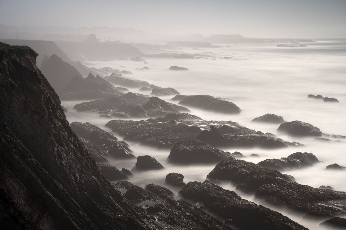 This Black & White, long exposure photograph, captures a view the Stornetta Lands that lie south of the Point Arena Lighthouse isthmus. The monochromatic presentation accentuates the layers of each rock and the seemingly endless depths of this coastline, created by millennia of interactions here at the Cascadia subduction zone, as the Pacific Plate dives underneath the North American Plate.